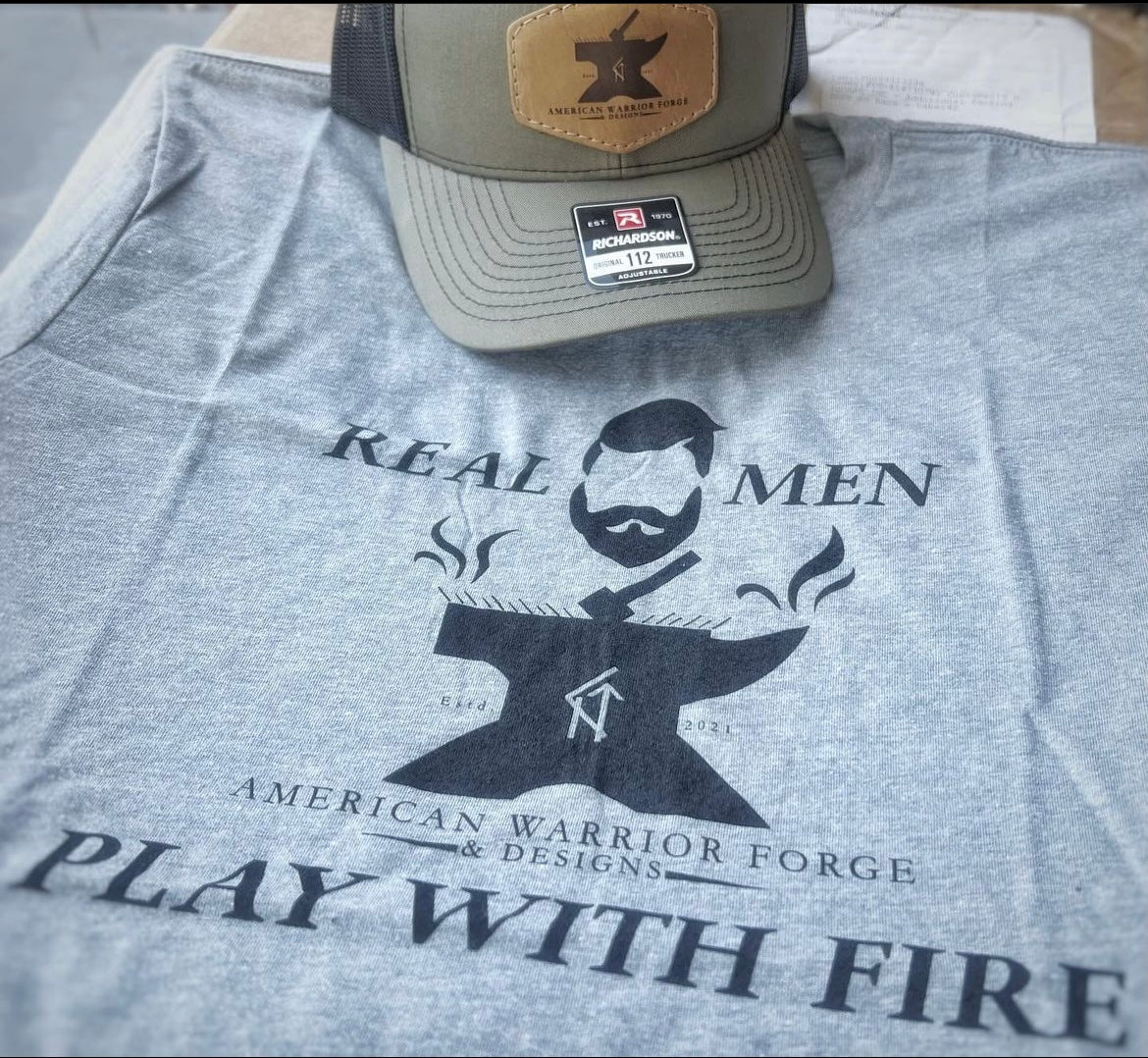 Handcrafted in Maine by C. Richard’s Leather, these quality hats feature real American leather patches sporting the American Warrior Forge logo. Choose from 3 designs, All Black, sage green /black, or Charcoal/White.