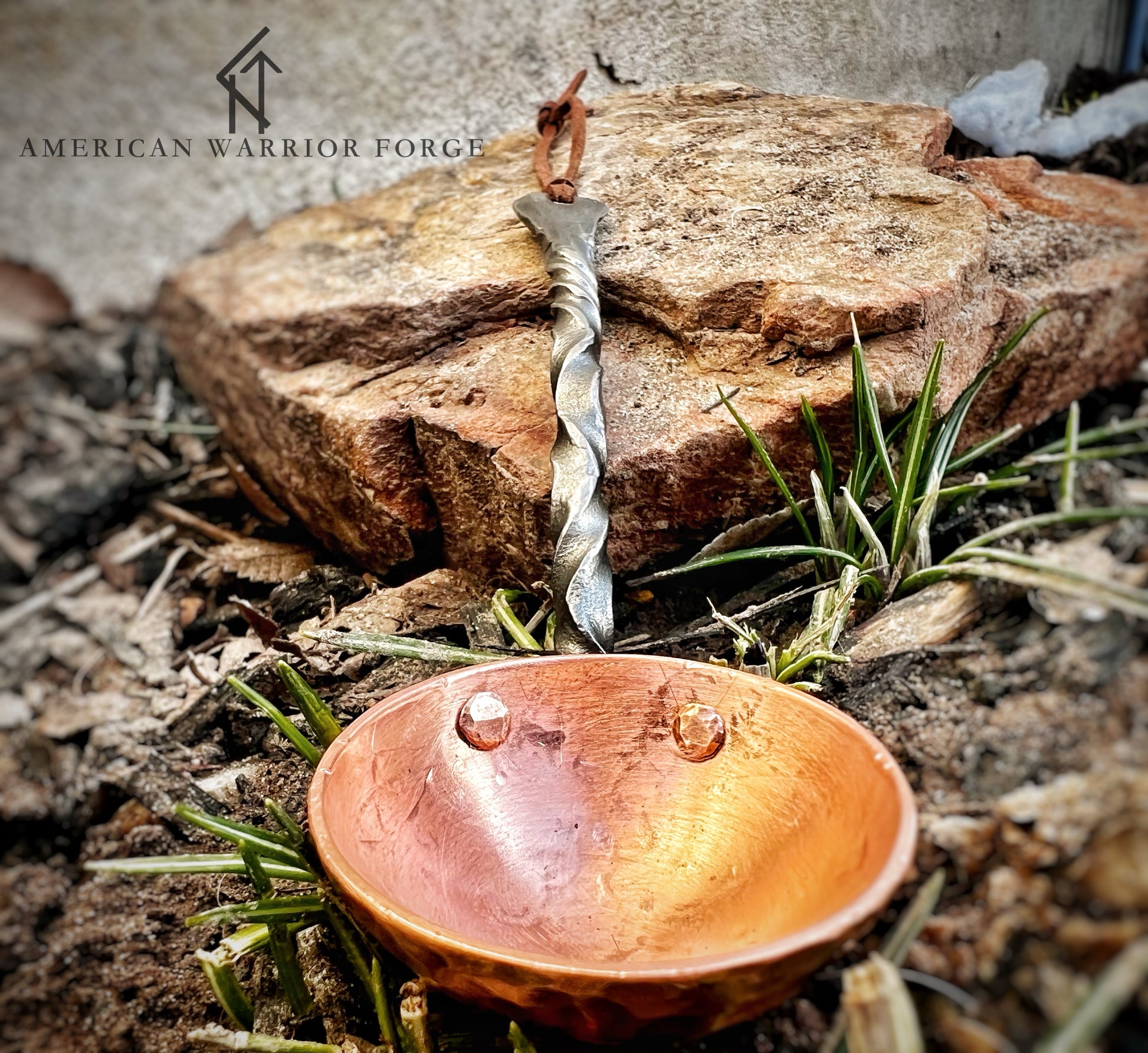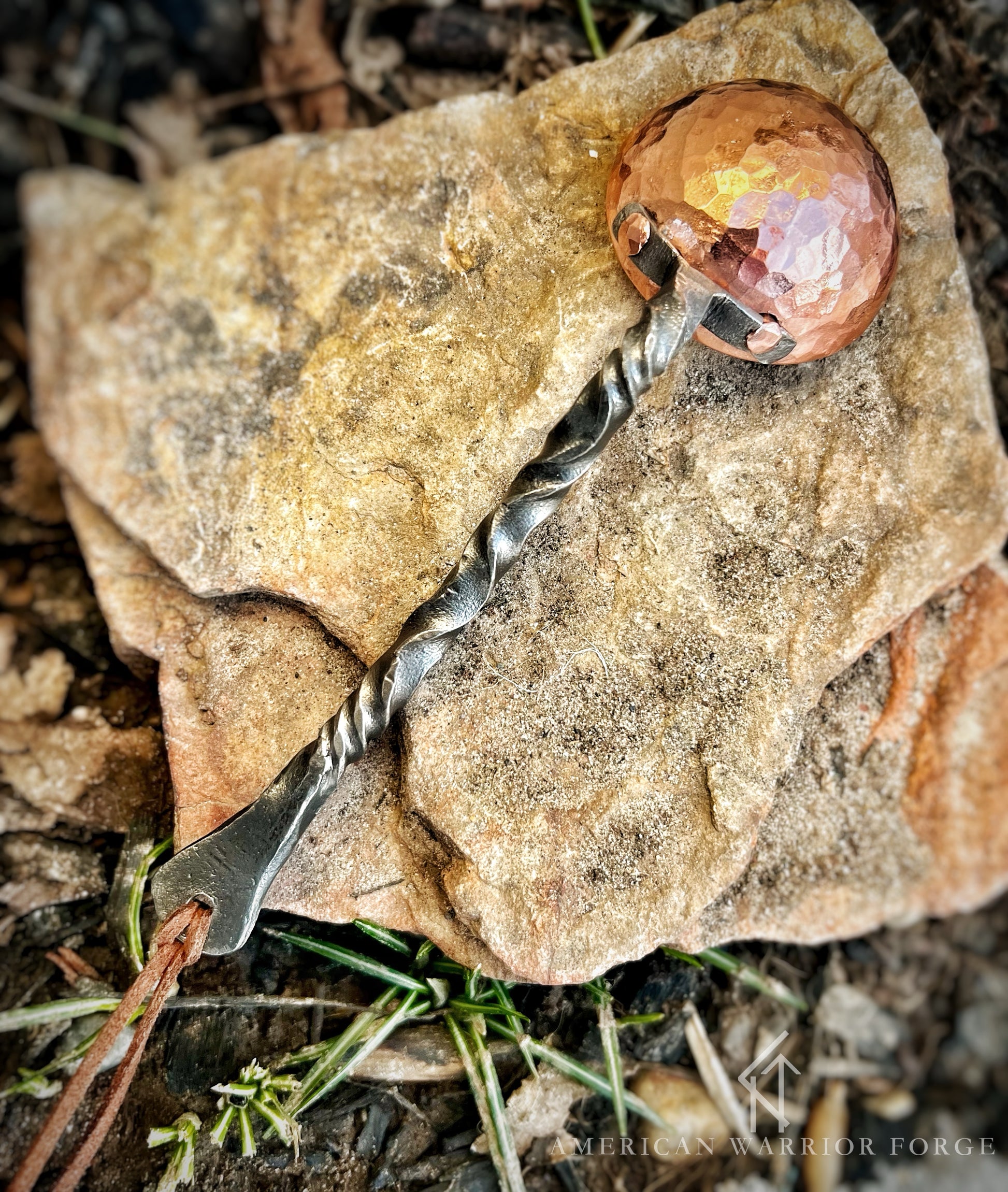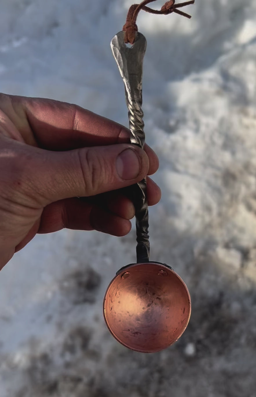 This hand forged coffee scoop/measuring spoon is made of solid copper and stainless steel with a food safe wax finish. Featuring a decorative twist and faux leather tassel in the handle, this scoop/spoon measures approximately 1.5-2TBSP.