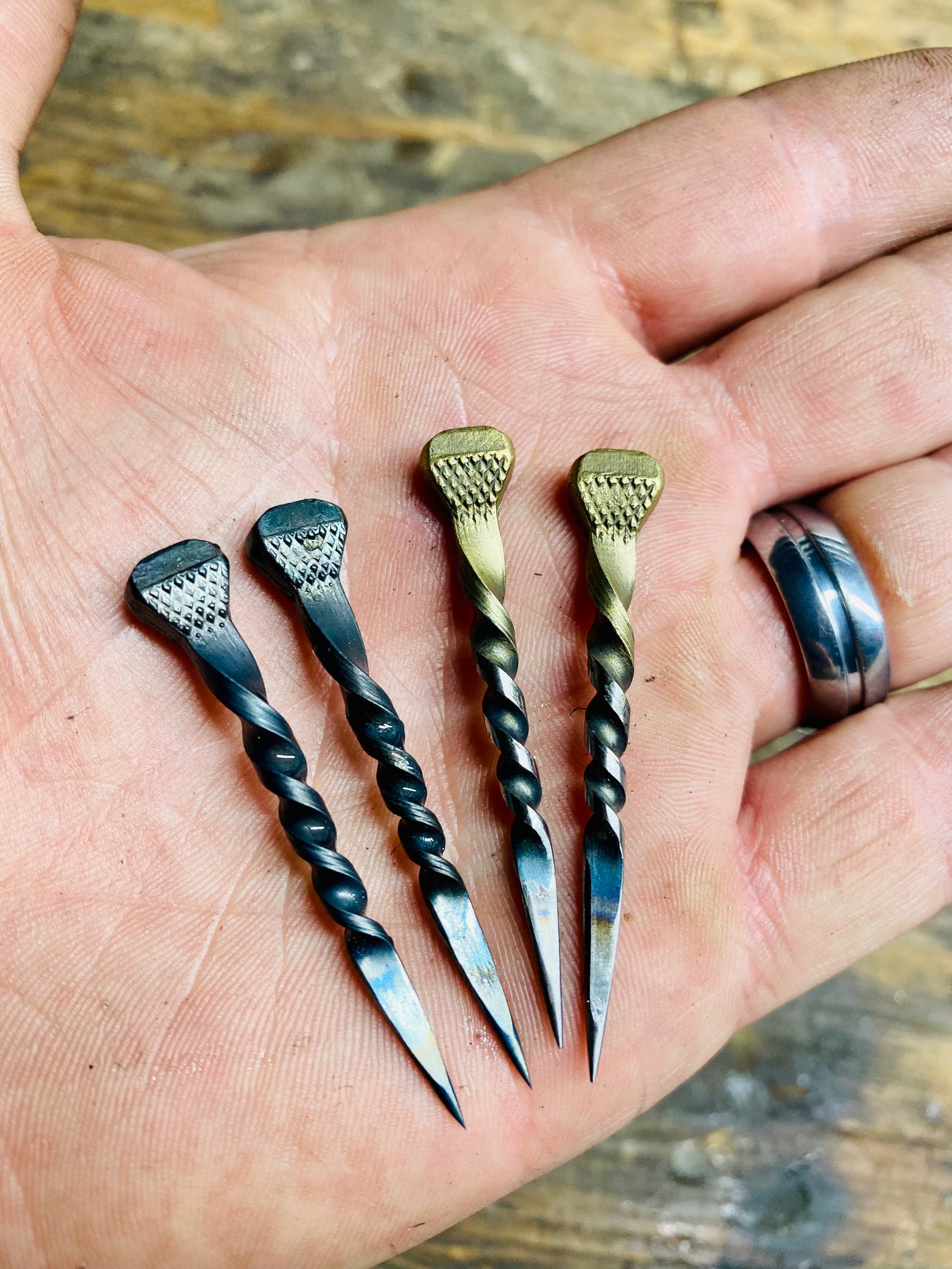 Each of these cowboy toothpicks are handmade from #6 horseshoe nails. I offer two different types, each with three finish options. There are the regular twisted horseshoe nail toothpicks as well as reverse twist horseshoe nail toothpicks. Each kind come in a wire wheel/polished finish, a black oxide/bee’s wax finish, and a brass brushed/polished finish. Since they are all handmade, every pick is unique.