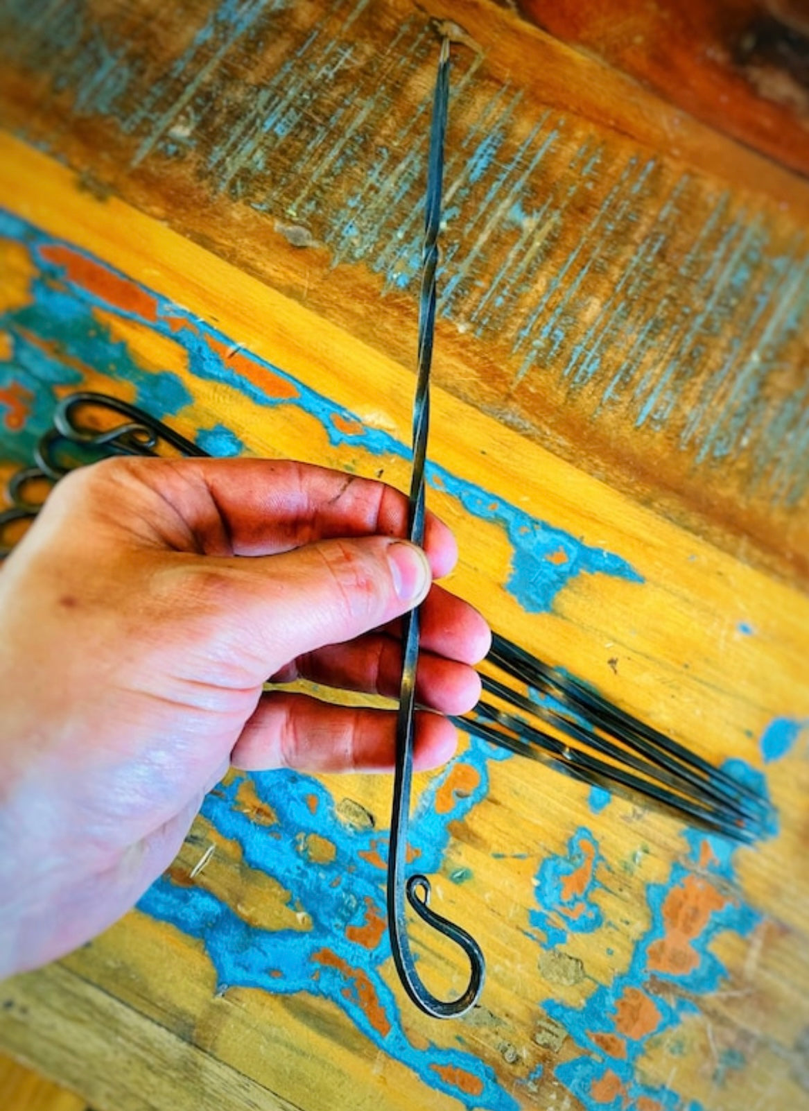 To care for your forged steel skewers, treat them like a cast iron skillet. I use a product called Axe Wax. It’s all natural, good safe, and works great on a variety of materials including steel, wood and leather. After use, hand wash, hand dry thoroughly, and apply a light coat of Warrior Wax or other food safe wax or oil such as mineral oil.