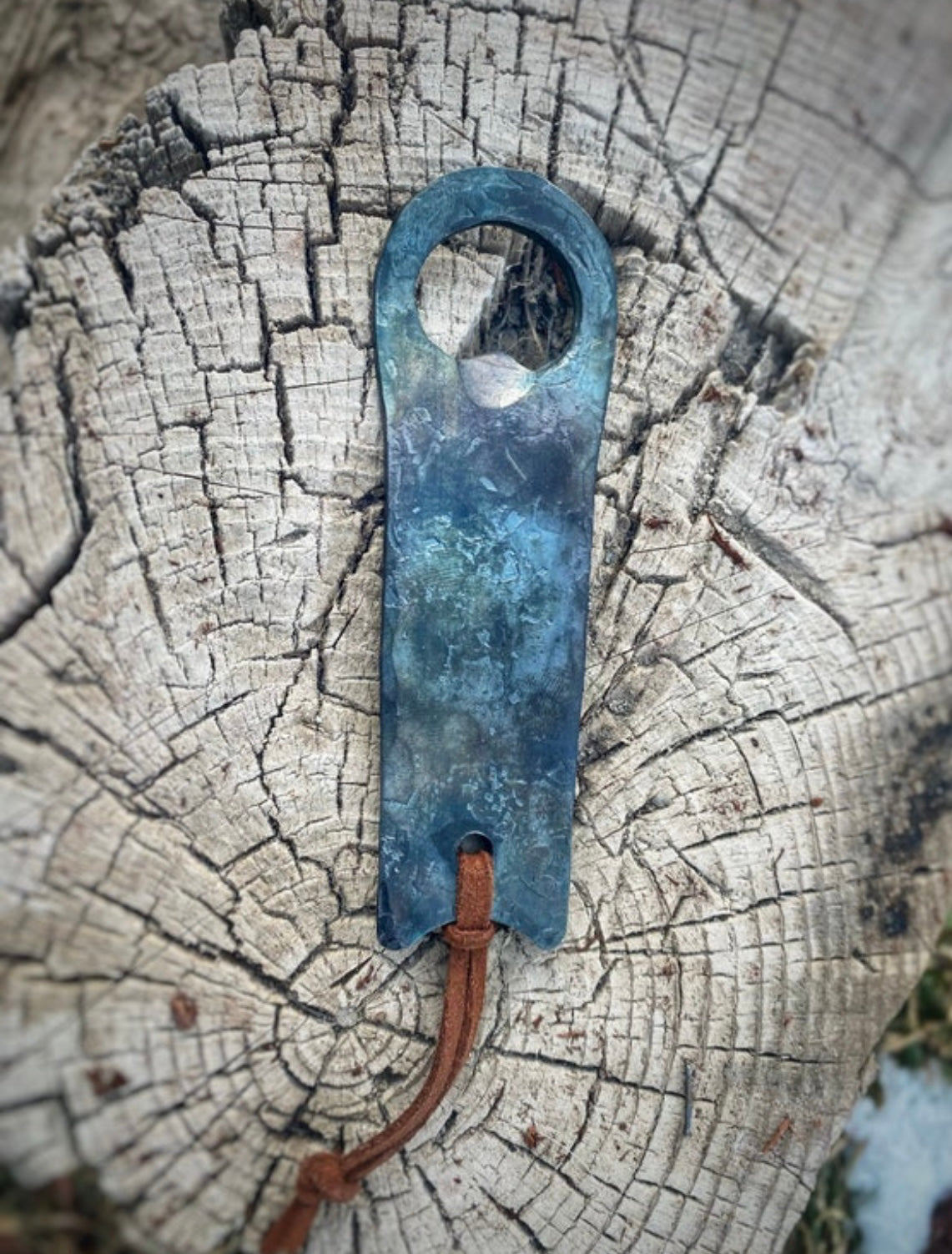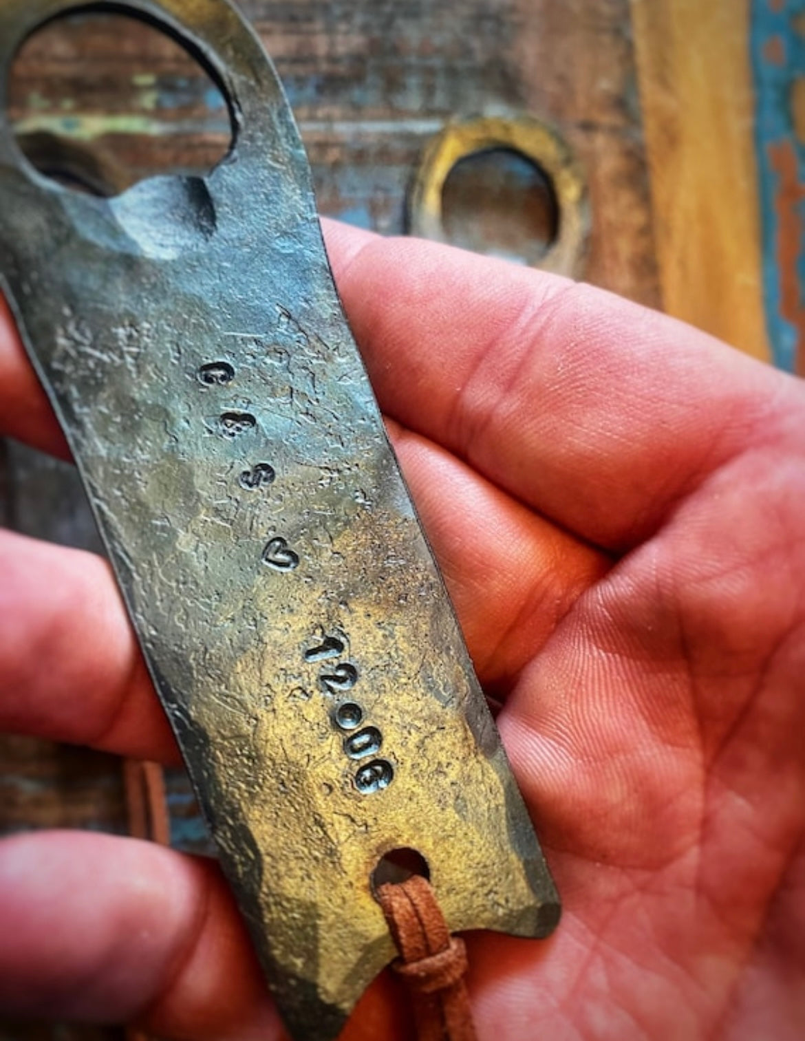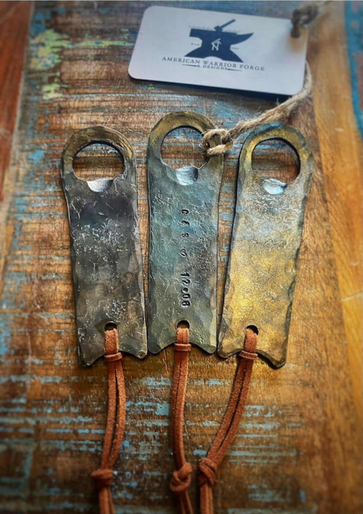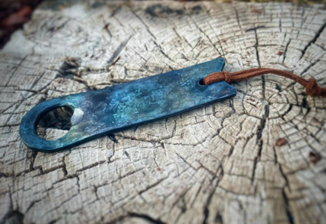 These bottle openers are hand forged and feature rounding hammer texturing. The blacksmith’s paste wax finish offers unique coloring and corrosion protections. A faux leather tassel is hand-tied on the tail end of every bottle opener so if can be easily hung up when not in use. Each opener is able to be personalized with up to 20 characters. The unique, handmade nature of these openers, coupled with the option for personalization makes them great gifts for weddings, groomsmen, anniversaries, Valentine’s Day, and more.