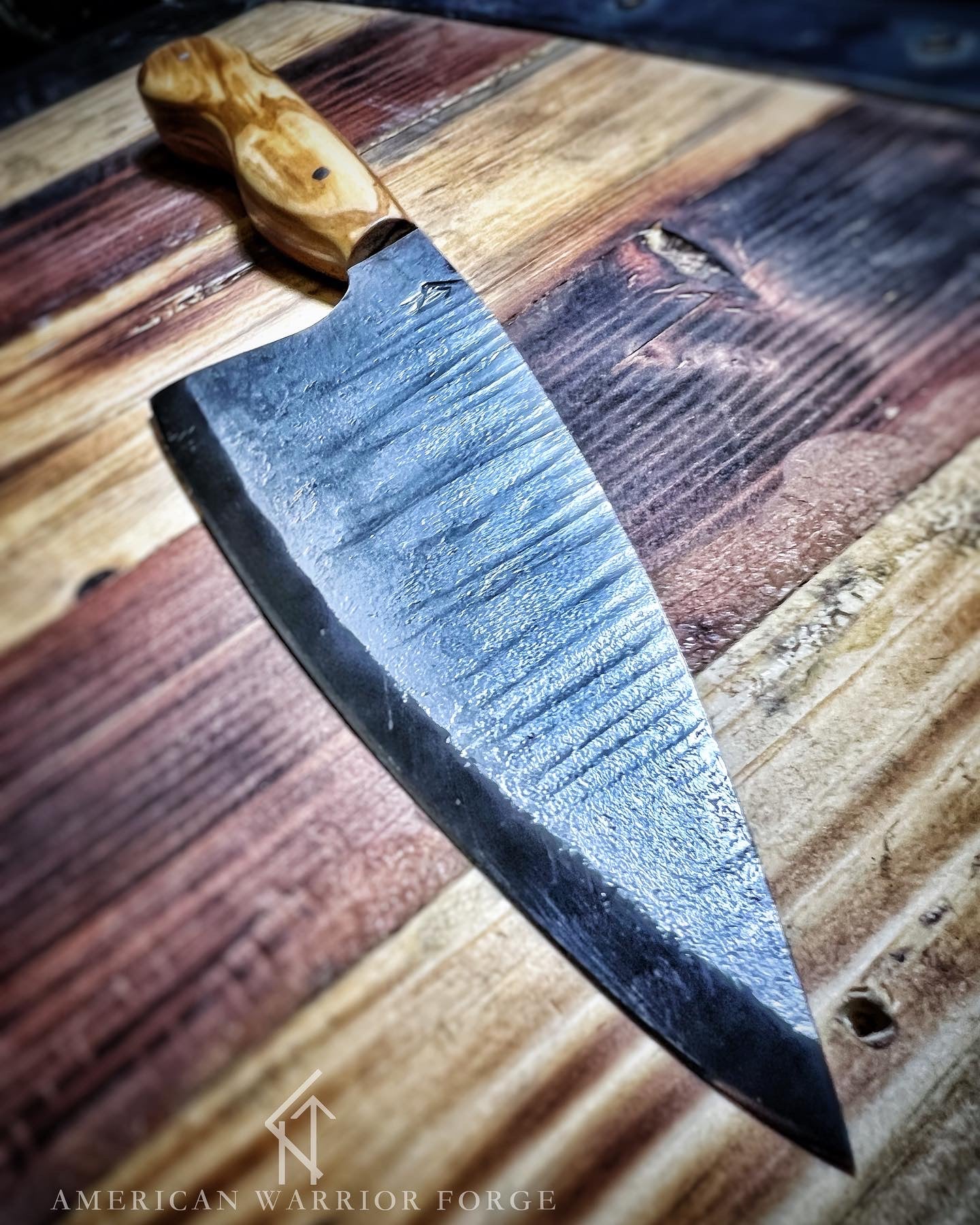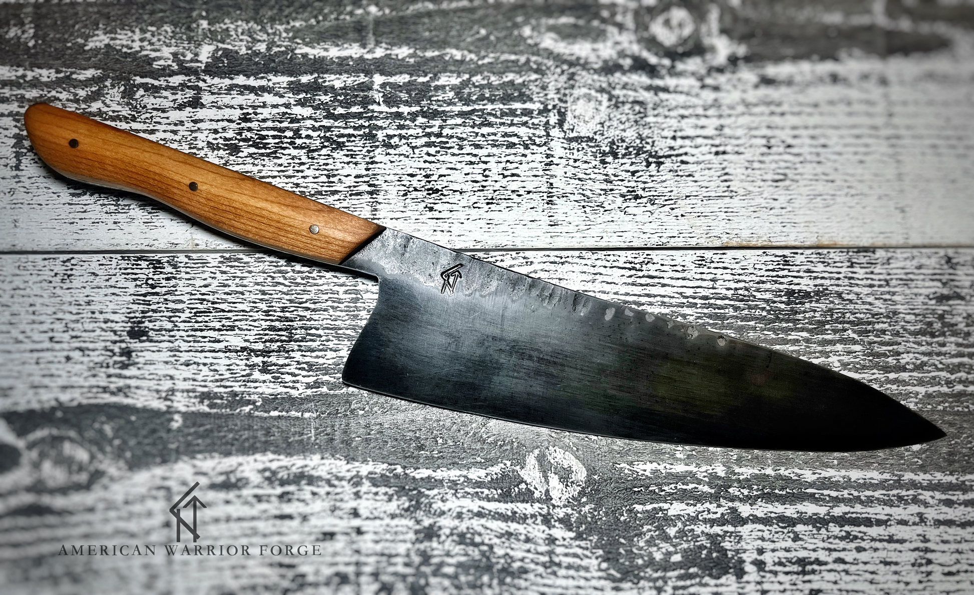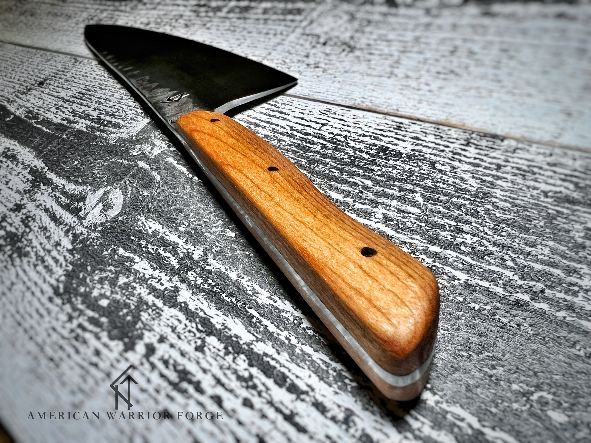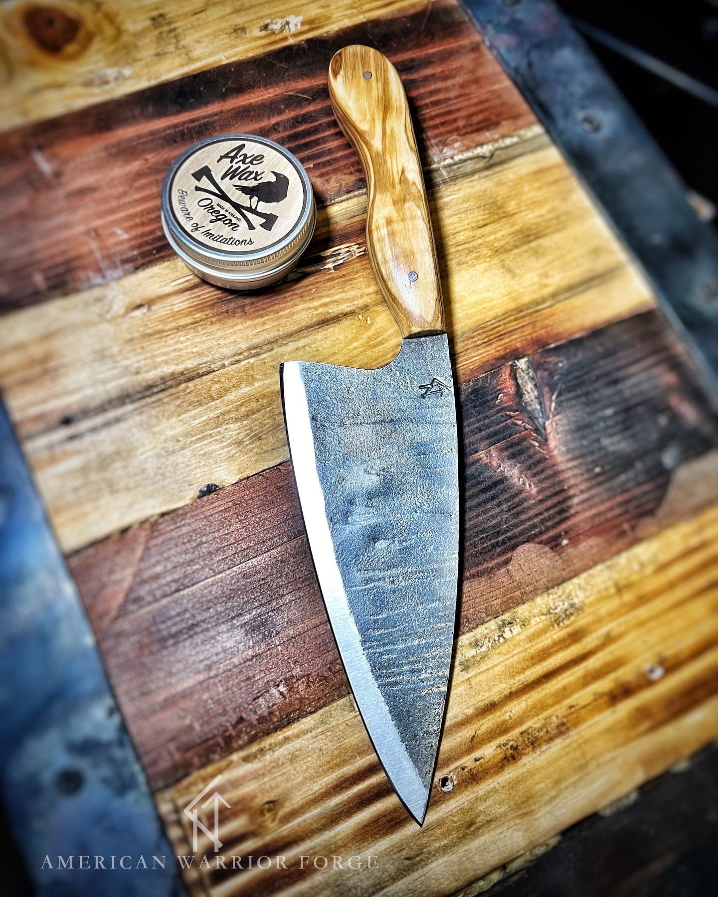 This brut de forge 7” bladed chef knife is hand forged in Idaho out of high carbon steel. The handle material can be selected from a wide variety of materials from olive wood and other natural toned woods, to dyed and stabilized burled woods. You get to select the finish of the blade as well. List all preferences in the special instructions box at checkout. I will then email you to work out any final details. Since these knives are handmade and are made to order, they take about 3-4 weeks from the time the order is placed until they are shipped. You play a part in the overall design of this chef knife, making it a truly unique item. The perfect addition to any kitchen and the perfect gift for anyone who loves to cook.