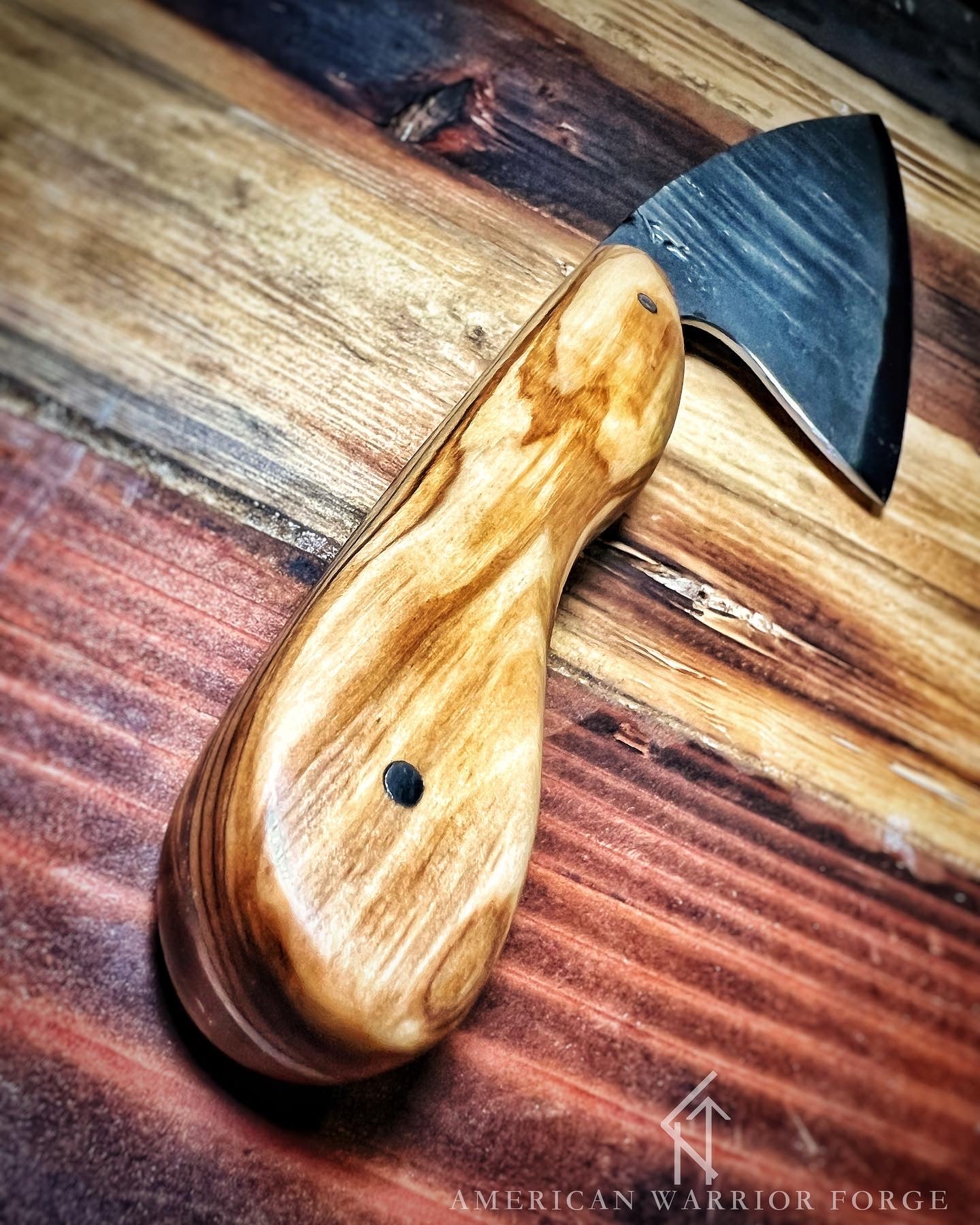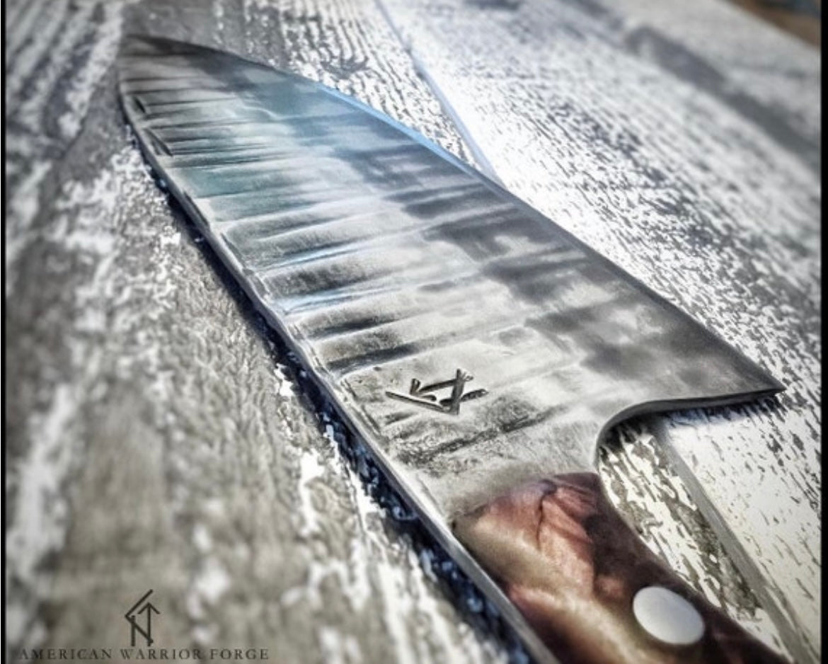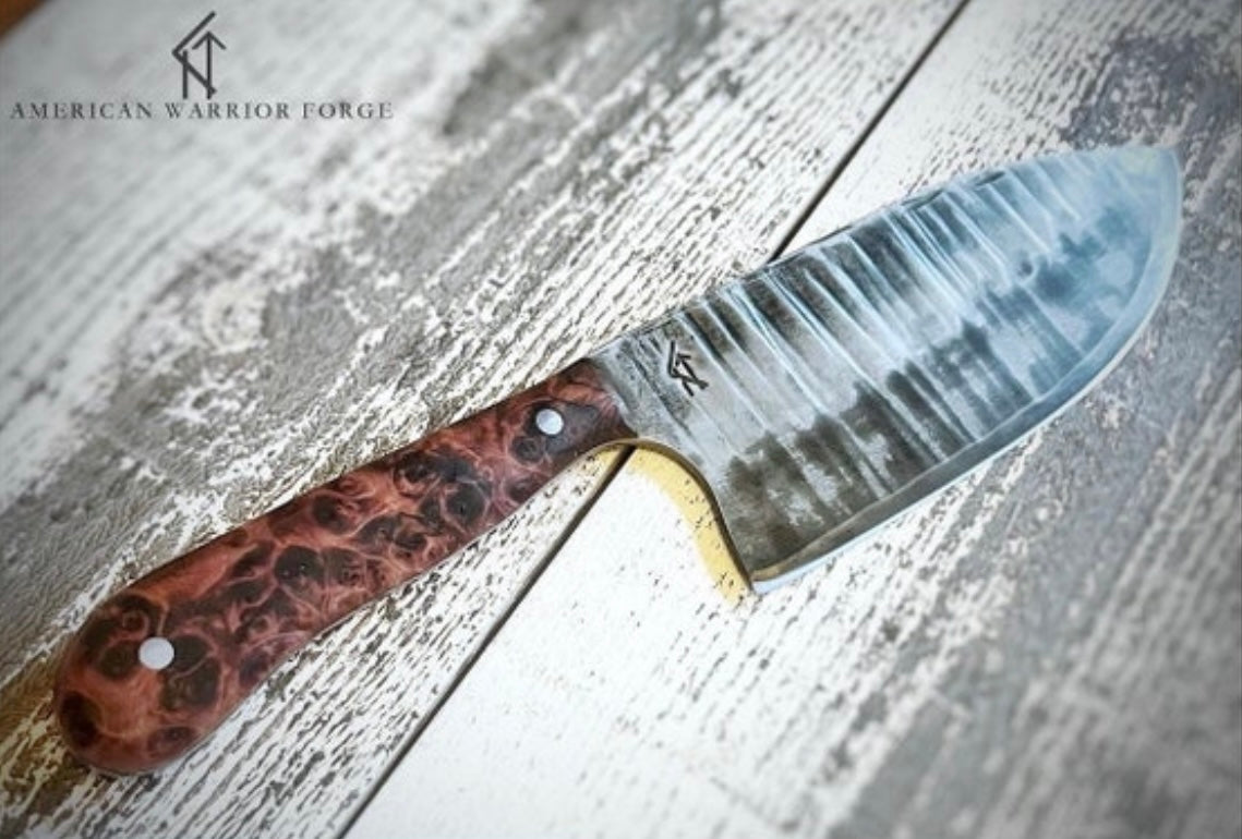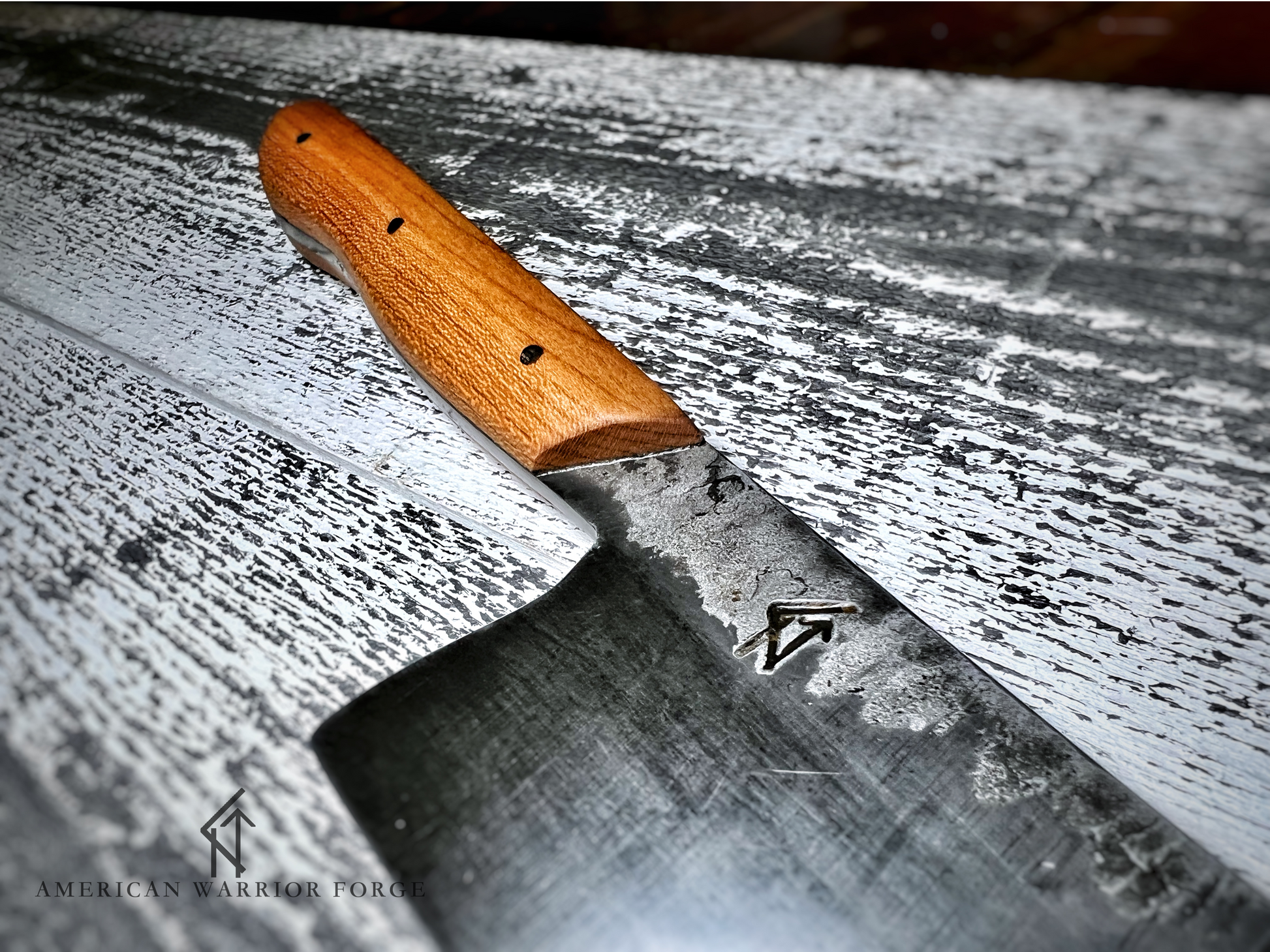 This brut de forge 7” bladed chef knife is hand forged in Idaho out of high carbon steel. The handle material can be selected from a wide variety of materials from olive wood and other natural toned woods, to dyed and stabilized burled woods. You get to select the finish of the blade as well. List all preferences in the special instructions box at checkout. I will then email you to work out any final details. Since these knives are handmade and are made to order, they take about 3-4 weeks from the time the order is placed until they are shipped. You play a part in the overall design of this chef knife, making it a truly unique item. The perfect addition to any kitchen and the perfect gift for anyone who loves to cook.