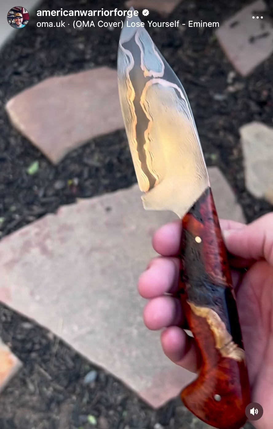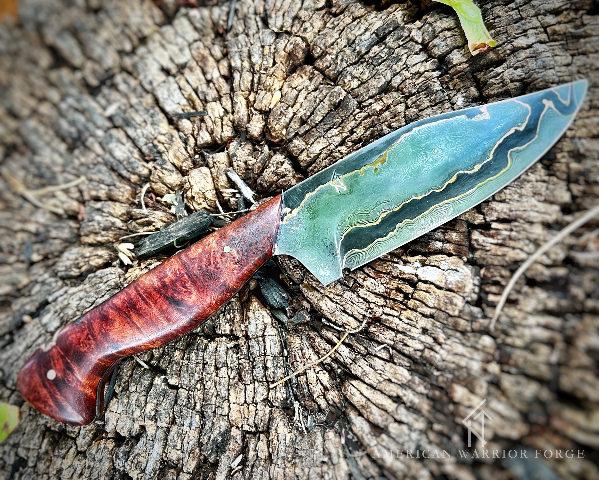 This 5” clip point is handmade from copper clad Damascus with stabilized bloodwood burl handle scales and nickel silver pins. The steel is properly and meticulously heat treated to ensure the blade is tough and will hold a good sharp edge. A custom leather or kydex sheath can be added on as well otherwise the blade will come with a soft zipper protective case.